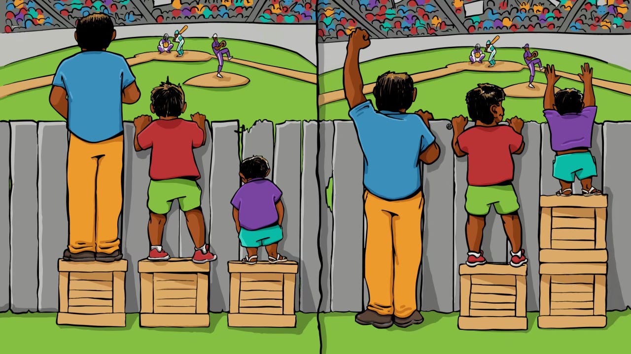 Imagine this popular image of three people standing behind a tall fence trying to watch a baseball game. One person is tall enough to see over the fence easily. One person can almost see but not quite. The third cannot see the field at all. If fairness means everyone gets the same wooden box to stand on, then the tallest person now sees even better. The middle person might finally catch a glimpse. The shortest person may still see nothing.